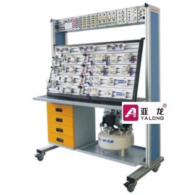Пневматическая учебная система Yalong YL-1330A состоит из учебного стола, учебной операционной панели для построения пневматических схем, электрической части управления и т.д. Электрическая часть в основном состоит из модуля ПЛК, релейного модуля, силового модуля, модуля кнопок и других элементов.