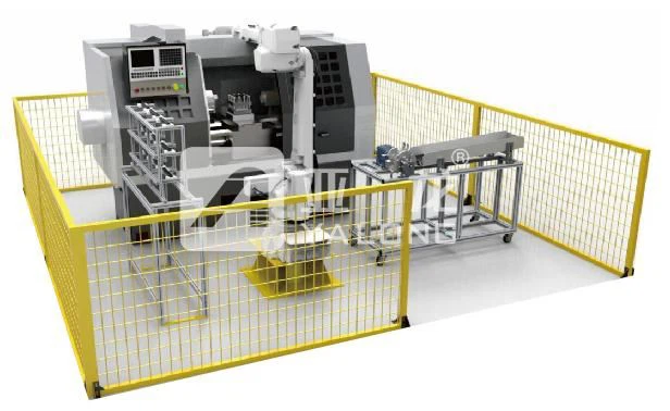 Учебная система по загрузке и выгрузке деталей на станках с помощью робота YL-1626A (далее именуемая 1626A) включает в себя роботизированную платформу, основания роботов, промышленного робота, станок с ЧПУ, шкафы управления (с контроллерами изменения диапазона), учебные верстаки для программирования, транспортную систему, систему защитных ограждений, инструменты и т.д.