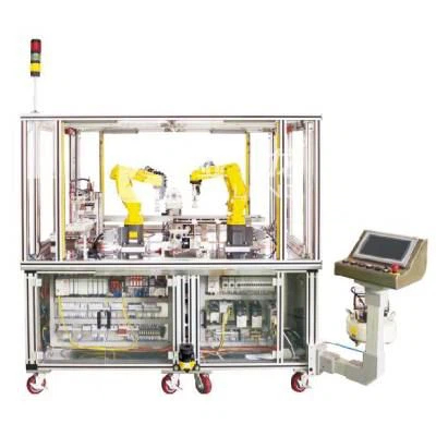 Учебный тренажёр по кооперации промышленных роботов YL-1805B в основном состоит из блока подачи и транспортировки, блока визуального контроля, блока сборки с помощью робота, блока контроля готового изделия, блока управления и отображения, а также блока защитных ограждений. Электрические компоненты установлены на двух сетчатых панелях под оборудованием и защищены прозрачной дверью из оргстекла. Такой способ раздельного монтажа механической и электрической частей соответствует реальной производственной практике.